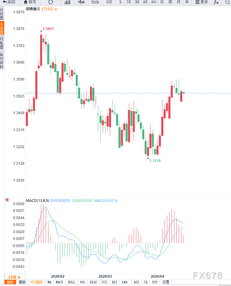 在技术面上,日线级别显示英镑兑美元维持在上升趋势中运行,价格仍站稳于中长期均线上方,整体结构偏多。1.3600区域构成上方关键阻力,此前多次测试未能突破,显示上行动能有所减弱。下方来看,1.3500为短期重要支撑,若跌破该位置,可能进一步回调至1.3420区域。动能指标方面,MACD高位回落,显示多头动能趋弱。